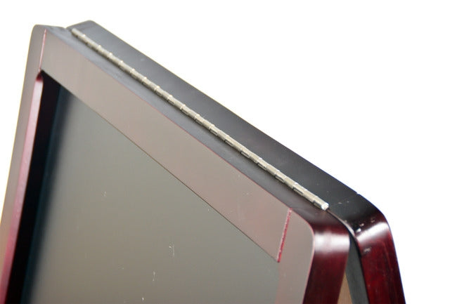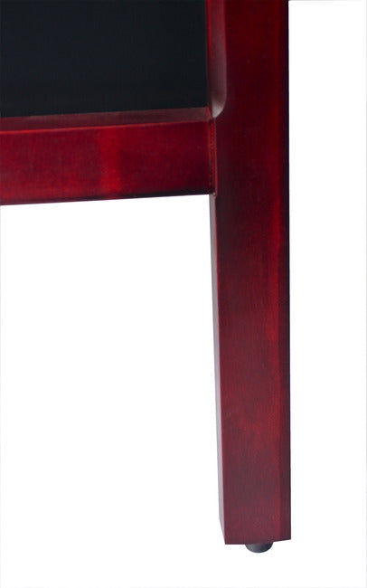 This A-Frame Sidewalk Chalkboard features a mahogany finish and can be used with chalk and liquid chalk markers. It is double-sided and sits on rubber stoppers to prevent scratched floors and added stability.