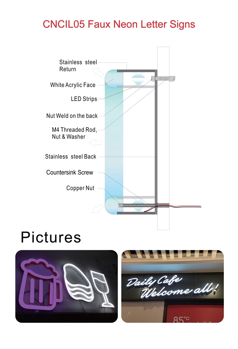 The Faux Neon Letter Signs are constructed of Stainless Steel return and Clear or White Acrylic face. LED modules are installed in the letters. The letters can be used both indoors and outdoors. You will get the classic look of Neon Signs with the energy saving and long life expectancy of LED lights.