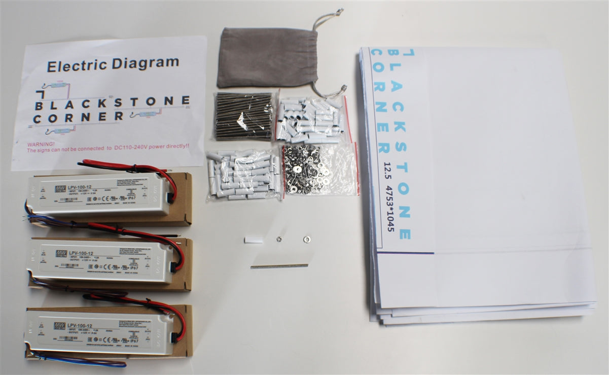 - Including Power Supplies, Electrical Wiring Diagram, Installation Pattern, Steel Studs, 1" Spacers ,Washers, and Hex Nuts
