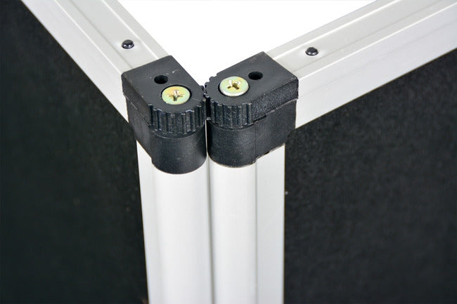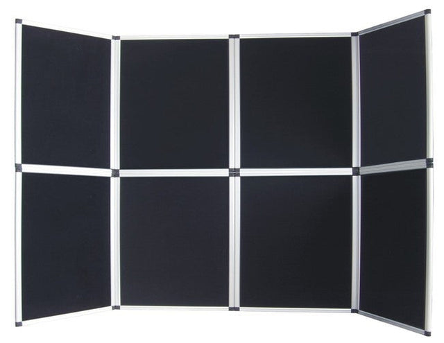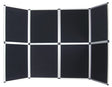 This product includes (2) sets of four connected panels with black velcro on both sides and sturdy aluminum frames. It also features rounded corners for numerous display arrangements to fold and expand.