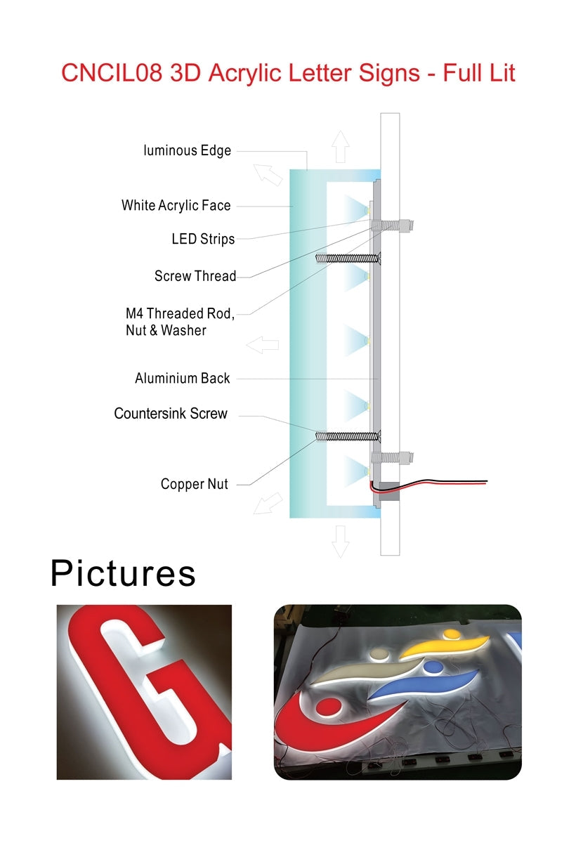 The 3D Acrylic Letter Signs are constructed of 1.125" Acrylic with LED modules. The letters are cut and engraved by CNC router, which creates a hollow space for the LED to be embedded. The letters can be used both indoors and outdoors.